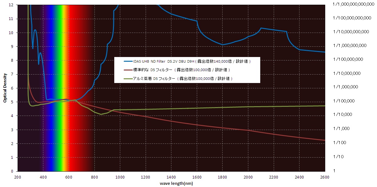 IDAS UHB-RS ND Filter D5.2V D8U D9Hの、430〜約660nmの可視域のDは5.2(1/140,000の光量)で、800〜2,600nmの熱線赤外域の平均Dは9以上(1/10億以下)、2,600〜4,000nmの赤外域で平均D8以上(1/1億以下)です。