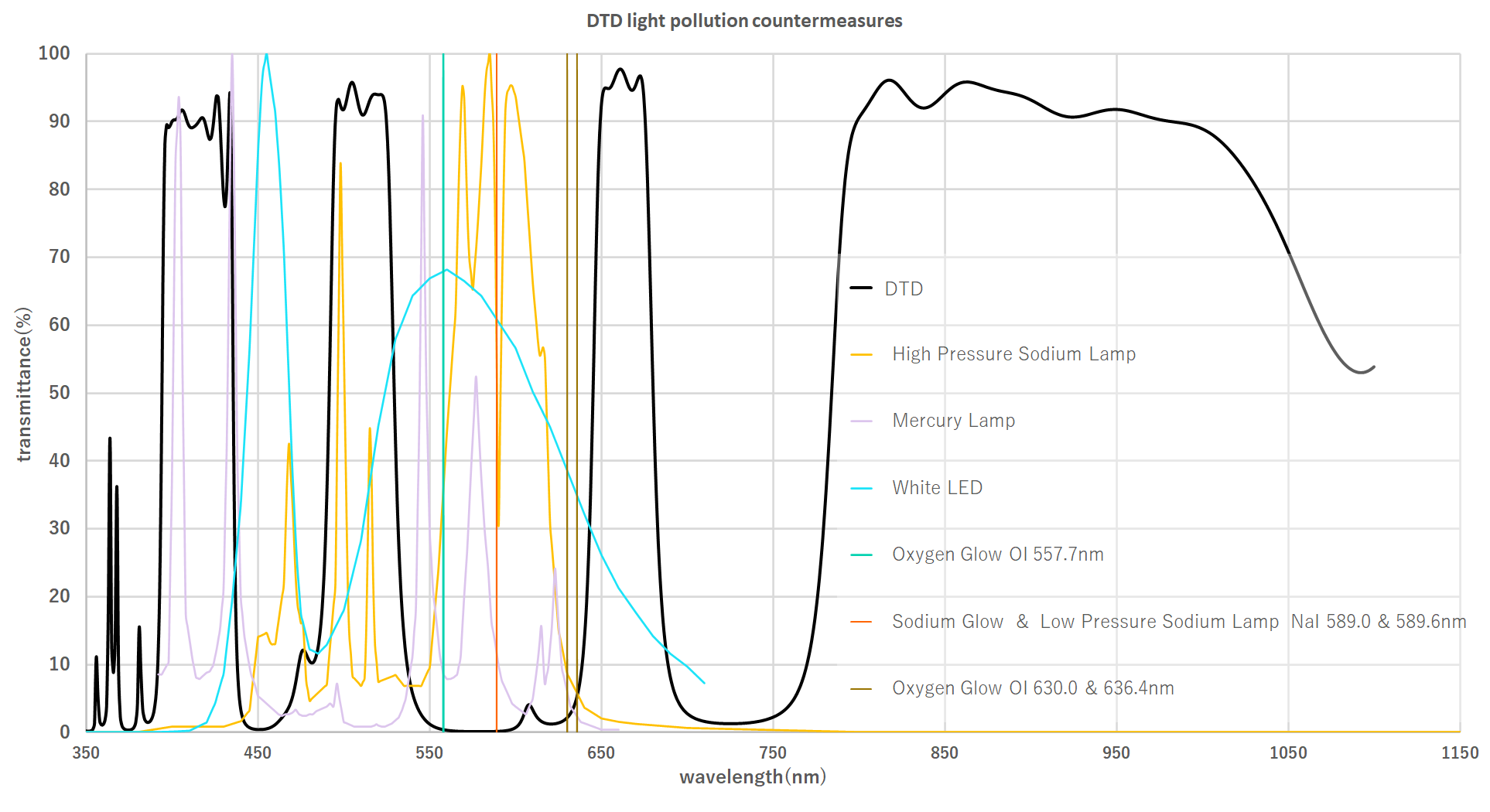 The IDAS DTD filter not only passes through the Ha and OIII regions in the same manner as of the IDAS NBZ, but also provides a pass band for comet ion tails in the visible spectrum range (400nm to 700nm, susceptible to light pollutions). This filter furthermore enhances the contrast of the continuous spectrum lights from comet dust tails, galaxies and the Milky Way by making use of the NIR region that is hardly interferenced by light pollutions. The DTD filter makes it possible to shoot more objects in the visible to NIR spectrum range at higher contrasts.