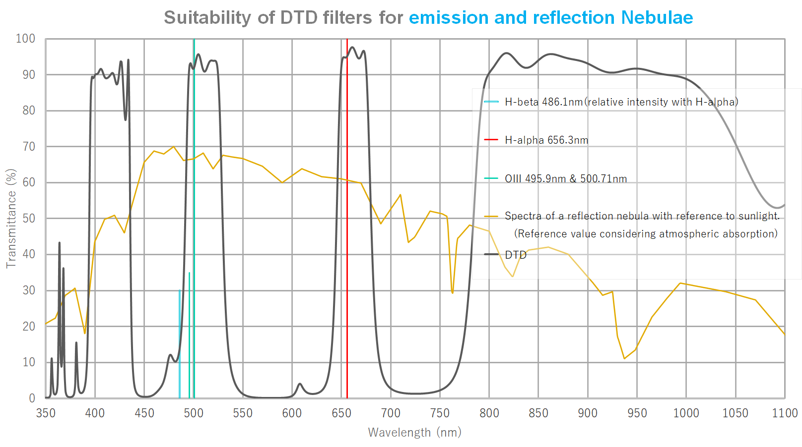 For nebulae with Hα and OIII emission lines, the DTD will increase contrast by using a quasi-narrowband transmission band in the visible range, while keeping the light loss of continuous spectrum objects minimum by using the entire transmission band in the visible and infrared ranges.